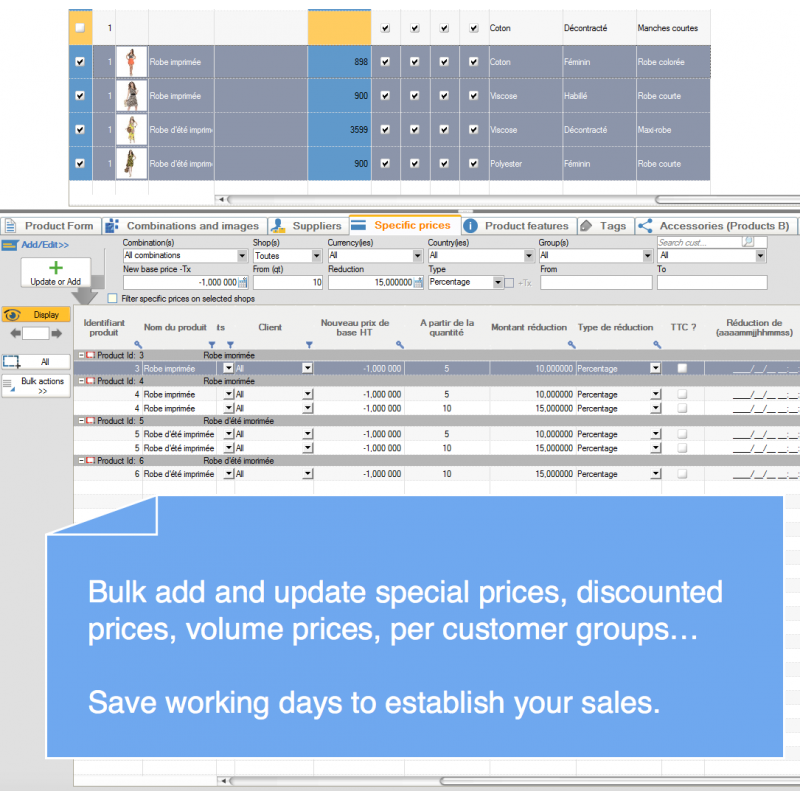 Management and memorisation of price and weight impacts by attribute (and not only by declination) for each product