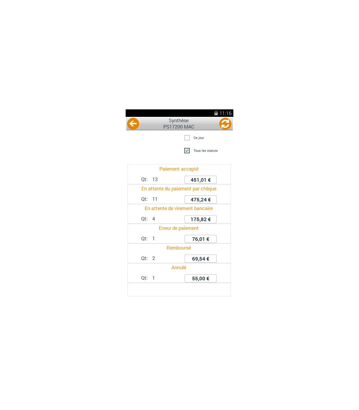 - Affichage du nombre de commandes et chiffre d'affaire par statut. Filtre possible sur la date du jour et types de statuts.